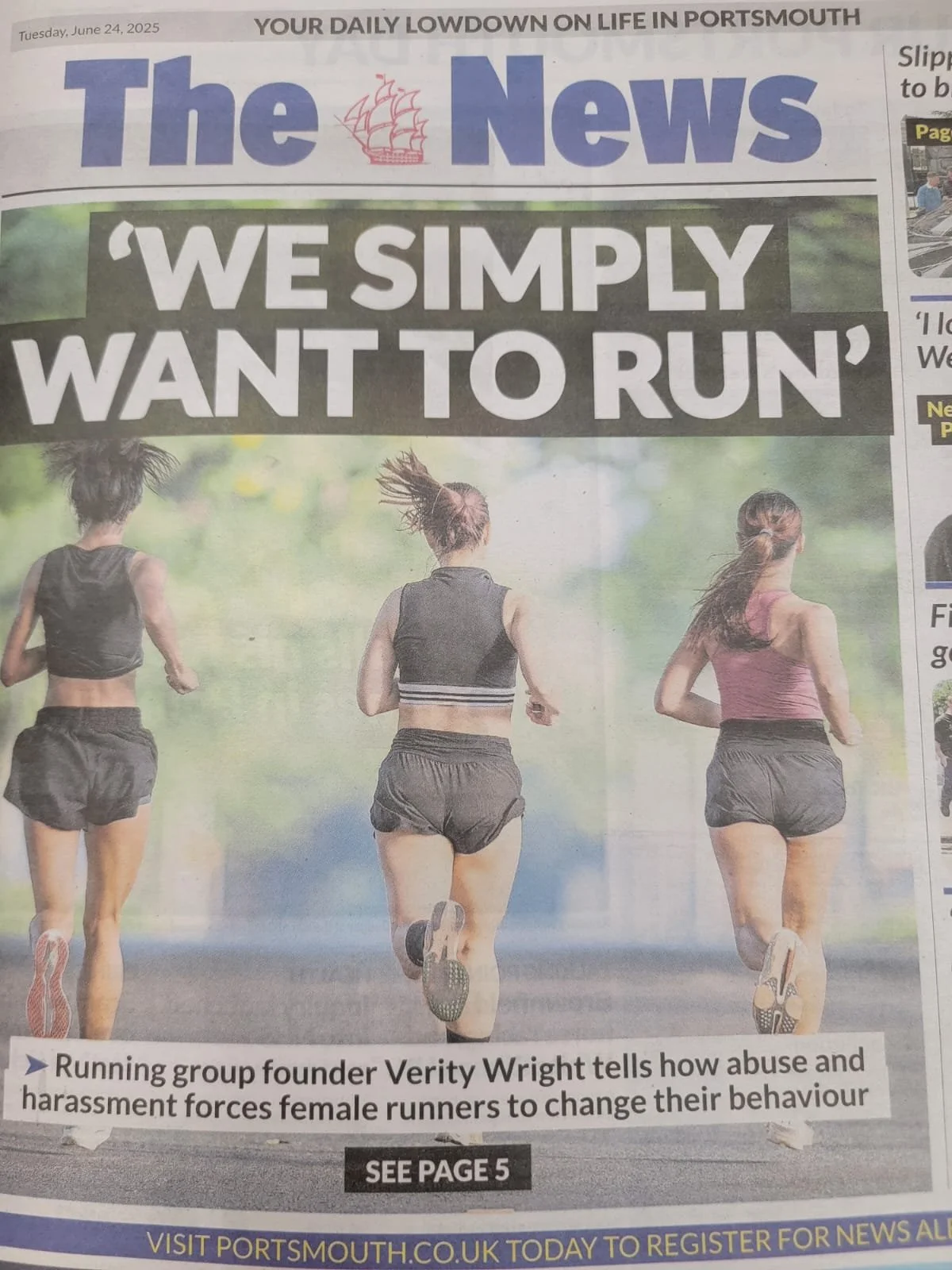 RunVerity’s advocacy efforts were featured on the front page of The Portsmouth News, highlighting the daily safety issues women face when running and calling for local councils to take meaningful action.